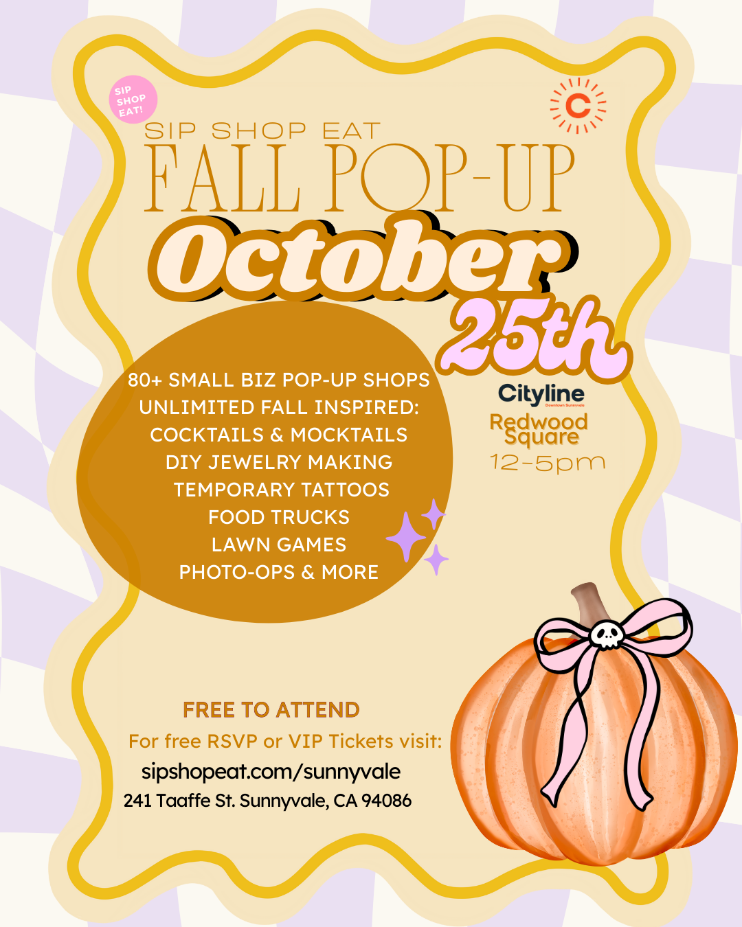 Join us the Sip Shop Eat Fall Pop-Up for a day of good vibes, music, local finds, and fall fun!